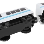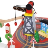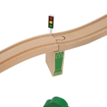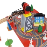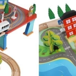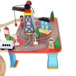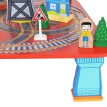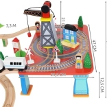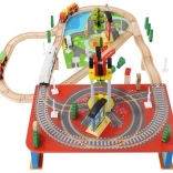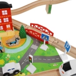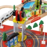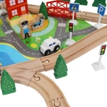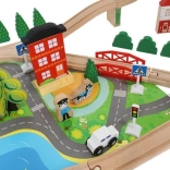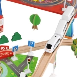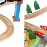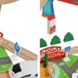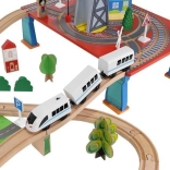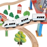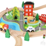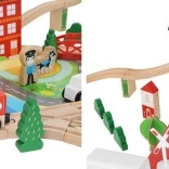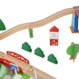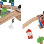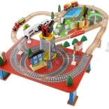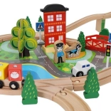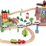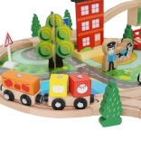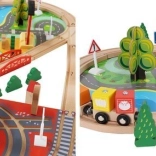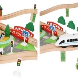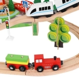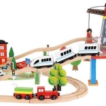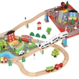 Wooden train set with a total of 88 precisely crafted pieces, including tracks, freight and passenger trains, car, trees, and traffic signs. The fun is in the ability to create your own route, while the magnetic connections ensure easy operation.