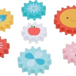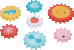 The product includes a sturdy wooden base and seven colorful gears, designed to help children gain new skills as they turn and place the gears. Vibrant patterns, like the sun, apple, and bird, make this toy visually engaging and attractive.