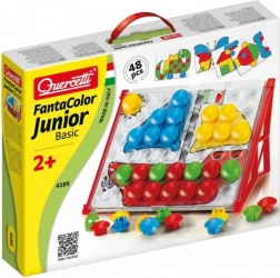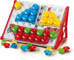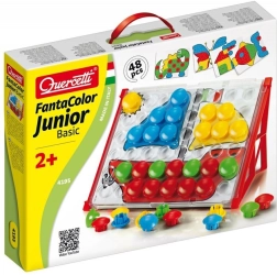 Discover the creative QUERCETTI mosaic for the little ones! The set includes 48 large unbreakable pegs with a diameter of 32 mm, a transparent perforated board, and 8 double-sided cards with 16 templates. A practical stand for inclined positioning makes play easy at home and on the go. The game develops visuomotor coordination, fine motor skills, and creativity for children from 2 years.