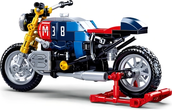 This detailed motorcycle model in the iconic café racer style offers a striking combination of blue, red, and yellow with the bold number 38. Realistic elements, such as functional wheels and exhausts, make it an attractive motorcycle building set for play and display.