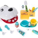 The set includes a toothbrush, mirror, accessory plate, and other tools for realistic play.