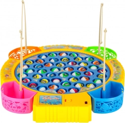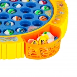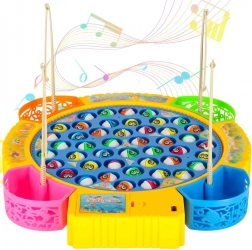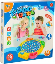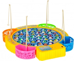 A fun family fishing game with a rotating platform and music, featuring 45 fish and 4 rods for 1–4 players. Supports reflexes, concentration, and dexterity, includes colorful removable cups for the catch and sound effects. Powered by 3× AA batteries.