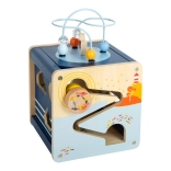 The cube offers interactive elements such as bead mazes, labyrinths, and shape fitting that support skills in color and shape recognition.