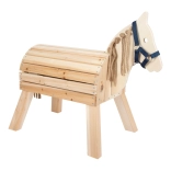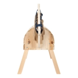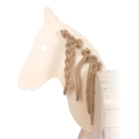 The children's wooden horse is made of durable untreated wood, which can be treated with protective varnish as needed. The height of the horse's back is 50 cm, allowing easy access for smaller children. The horse stands on stable legs, ensuring safety while playing both indoors and outdoors. The package includes a halter to which a lead rope can be attached for greater interaction during play. The wooden horse supports the development of children's imagination and fine motor skills thanks to the sisal mane and tail that can be braided and combed.