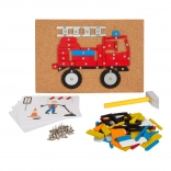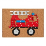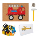 Comprehensive creative play set themed around transportation, including a cork base, wooden hammer, and many wooden pieces of different shapes and colors. Helps develop creativity, dexterity, and hand-eye coordination.