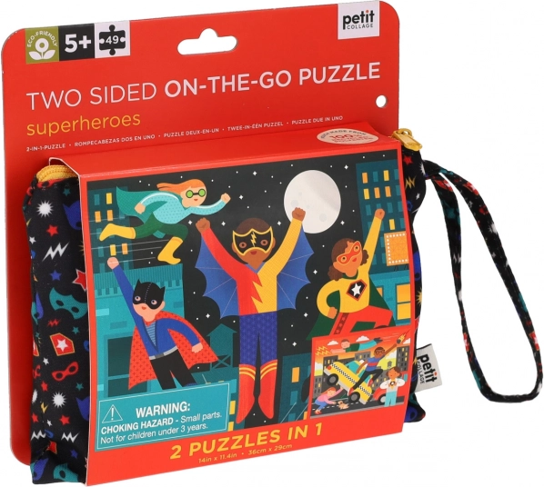 Discover the magic of the superhero world with this double-sided puzzle from Petit Collage. Every child can dive into an adventure that encourages shape and color recognition.