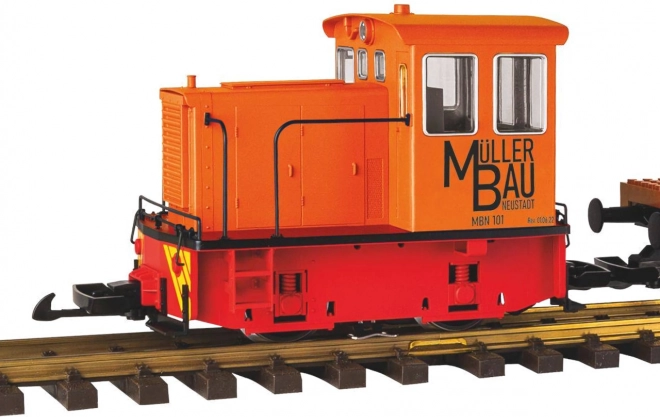 The starter set includes a basic loop with a freight train consisting of a GE diesel locomotive and two two-axle flat cars. The locomotive is wirelessly controlled using a pocket-sized remote control and is battery-powered.