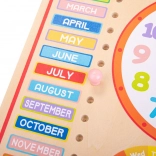 Discover a smart way to teach kids time and calendars: a wooden educational calendar with a large clock, days, months, seasons, and weather. The movable elements make learning playful and intuitive, developing fine motor skills, concentration, and basic knowledge of time and seasons. Made from high-quality wood and complies with European safety standards.