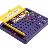 A clear board with holes and compartments for colored pegs keeps things tidy and makes it comfortable to play at home or on the go.
