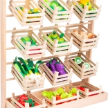 Practical wooden market stand small foot with 12 crates is ideal for kids’ shops and play kitchens. It offers a stable construction, plenty of storage space, and supports role-play and the development of social skills. Fruit and vegetables are not included.