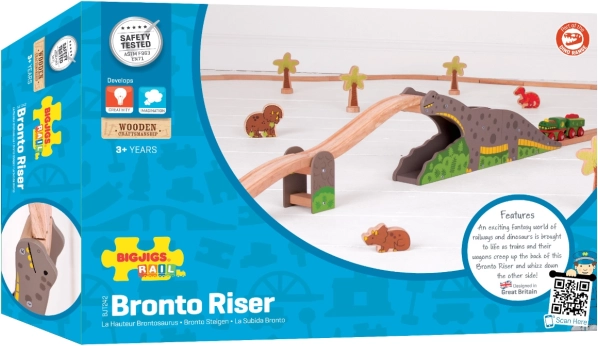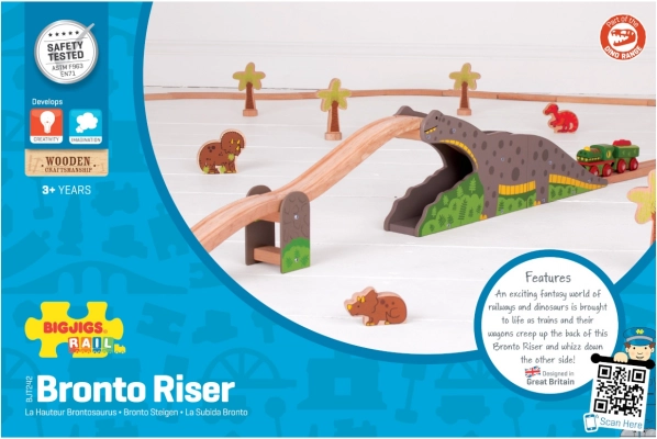 Discover the fun dinosaur bridge for wooden train sets, where the railway meets prehistoric adventure. The train runs over the back of a “brontosaurus” and through it, adding excitement and imagination to play while developing fine motor skills. Compatible with most wooden railway systems on the market.