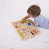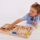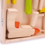 Excellent wooden toolkit with tools for all young DIY enthusiasts who want to develop their crafting skills. Includes a hammer, pliers, a drill, and wrench keys, all made from quality materials.