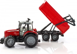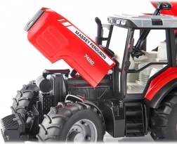 Enjoy realistic farm play with the MASSEY FERGUSON 7480 tractor and tipping flatbed. The 1:16 scale model stands out with precise workmanship, functional steering controlled via an extended steering wheel through the cab roof, and opening elements that let you look under the hood and into the cab.