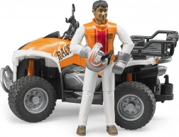 Action set for young adventurers: a plastic quad bike in 1:16 scale with a detailed driver figure. It features sprung axles, soft rubber treaded tires, and moving wheels for smooth riding. Includes a removable luggage compartment, tool holders, and a figure with articulated joints. Made in Germany from high-quality ABS plastic.