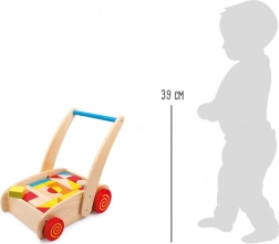 Discover the ideal aid for first steps — a wooden walker with a cart full of colorful blocks. The robust construction from solid wood and plywood provides stability, while beech blocks in various shapes (approx. 5–10 cm) invite creative play. Thanks to the comfortable handle at a height of 39 cm, children feel confident and safe.