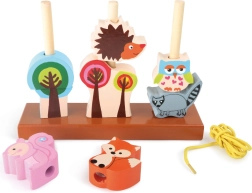 Stand with 3 pegs, string, 8 threading pieces (forest animals and trees)