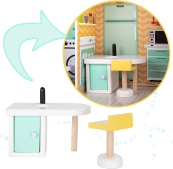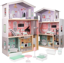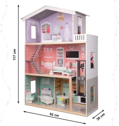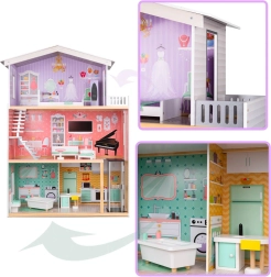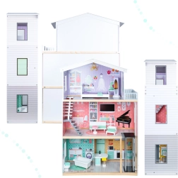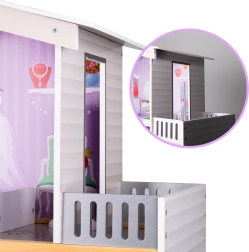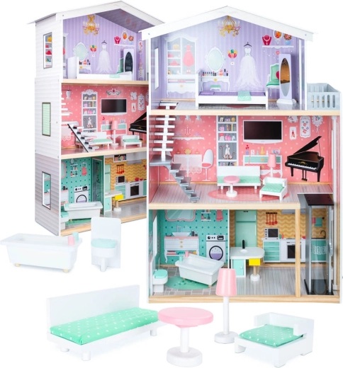 Discover the three-story wooden dollhouse equipped with four separate rooms, balcony, and even an elevator! The set includes beautiful wooden furniture pieces to bring each room to life.