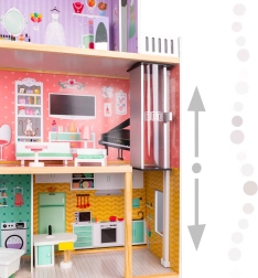 Wooden dollhouse with numerous details, offers separate rooms and an elevator for a more realistic play experience.