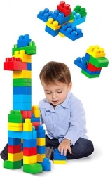 Kids can build tall towers, wacky castles, funny animals, and all kinds of imaginative creations. Playing with blocks naturally supports the development of fine motor skills, hand–eye coordination, and creative thinking. After play, all pieces store in a practical zippered bag with a handle, which is great for travel too.