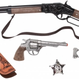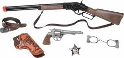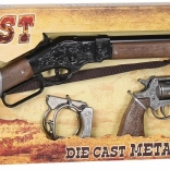 Turn kids’ Wild West play into a realistic adventure. This large cowboy set combines classic looks, safe toy design, and quality materials. The metal cap rifle and revolver (8-shot strips) deliver the sound effects kids love, while the handcuffs and sheriff’s badge complete the outfit.