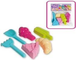 A fun sand set for little pastry chefs. With these molds, kids can make a cake, popsicle, scooped ice cream, and other treats. A shovel and rake are included for easy shaping. Lightweight plastic, easy handling, and a mix of colors guarantee hours of creative play at the playground or on the beach.