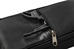 Two front pockets — the upper for small accessories (capo, cables, picks) and the lower for A4 sheet music — keep everything neatly at hand. Adjustable straps and a side handle ensure comfortable transport on foot and on public transit. The two-way zipper makes it easy to quickly open and store your instrument.