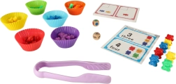 This colorful set connects learning and play. Children can count, compare, and match colors, solve simple problems, and practice concentration. Silicone cups help with sorting, while wooden dice and activity cards offer dozens of activities for independent and group play.