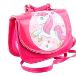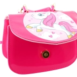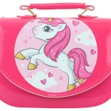 This pink handbag with a cute unicorn is a perfect accessory for everyday wear and special occasions. Its shiny surface, gold-tone metal details, and playful print make it a stylish piece kids love.