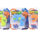 A fun plastic dinosaur-shaped pistol that shoots foam suction-cup darts. Ideal for safe play at home or outdoors. The package includes the pistol and 3 foam suction-cup darts. Easy to use, lightweight design, and safe fun for children aged 6 and up.