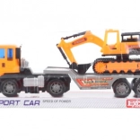 Plastic truck with excavator measuring approximately 28 x 10.5 x 8 cm. Package dimensions approximately 32 x 13 x 9 cm. Age 3+