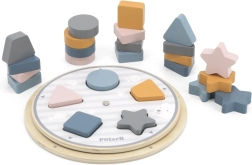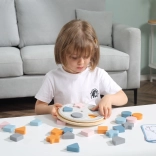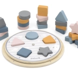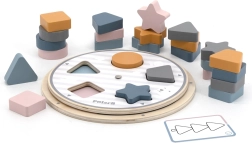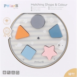 A clever wooden game for little ones that combines sorting shapes and colors, practicing fine motor skills and logical thinking. Includes wooden pieces, a rotating board, template cards, and a fabric pouch. Part of the POLARB collection, it is made from quality wood, painted with non-toxic paints in soft pastel shades, and it entertains, teaches, and develops children from an early age.