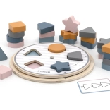 - rotating sorting board, set of wooden shapes (various colors and shapes), template cards, fabric pouch