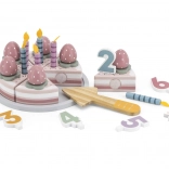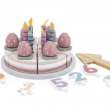 - 6 cake pieces, removable candles, decorative strawberries, number blocks, plate, wooden server