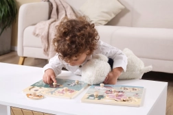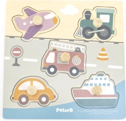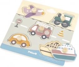 Wooden insert puzzle with a vehicles theme. Size of the wooden board approx. 22 x 22 cm. Package size approx. 22 x 22 x 2.5 cm. Age 18m+.