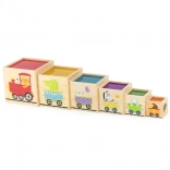 This amazing set contains six blocks of different sizes, each with its specific motifs. Children learn to differentiate numbers, shapes, colors, sizes, and animals. The blocks can easily be placed inside each other or stacked on top of each other, helping children understand the concept of arrangement and sequence.