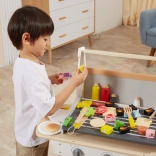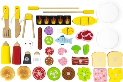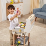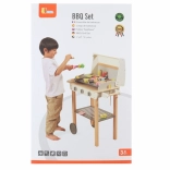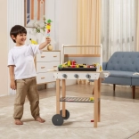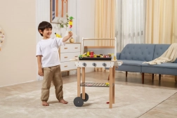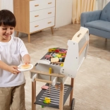 The rich set of 47 accessories includes vegetables, meat, plates, cutlery, tongs, seasonings, briquettes, and skewer sticks—all neatly stored on the top and bottom shelves. Thanks to the wheels and handle, the grill can be easily moved anywhere around the home or onto the terrace. Quality workmanship and thoughtful details ensure long-lasting, safe play.