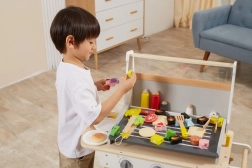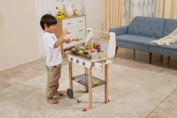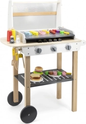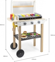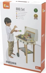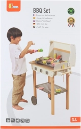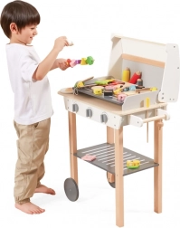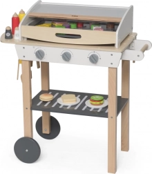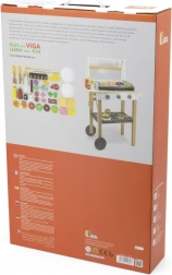 Discover the realistic wooden grill for kids by VIGA with 47 accessories for endless pretend cooking. Rotating knobs with click sound, a removable lid, a sliding grate, and wheels with a handle make this set a great choice for role play, developing fine motor skills and creativity.