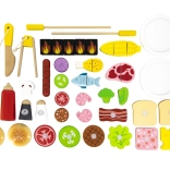 Vegetables, meat, seasonings, plates, cutlery, tongs, and skewer sticks—everything kids need to prepare burgers, skewers, and sandwiches.