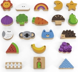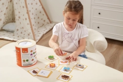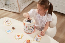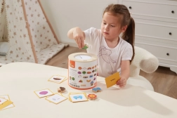 Catch and Find game. The set includes 20 blocks, a paper bucket, 20 playing cards, and a lid. Package dimensions approx. 16 x 15.5 cm. Age 3+