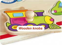 Each piece has a wooden knob, allowing children to lift and place the shape precisely in its spot—perfect for practicing fine motor skills.