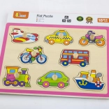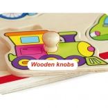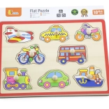 This high-quality wooden knob puzzle with vehicle motifs (airplane, taxi, bicycle, bus, etc.) offers a fun way to learn. Pieces with practical knobs fit into pre-routed openings, letting children naturally practice dexterity and logical thinking. The sturdy wooden board measuring approx. 30 × 22.5 cm is durable and suitable for everyday play.