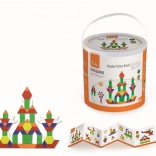 The blocks are made of lacquered wood and colored with non-toxic paints in vibrant shades. The practical plastic lid with a handle makes carrying and storage easy. The package also includes a little idea book to help beginners and young creators develop their imagination.