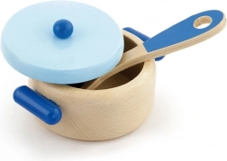 A stylish wooden kitchen set in blue for little chefs from 24 months. Includes a pot with lid, a pan with an egg, an oven mitt, and more accessories for a realistic cooking play. Quality wood, smooth edges, and safe design support creativity, fine motor skills, and role-play fun.
