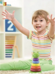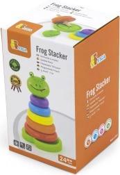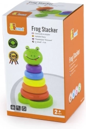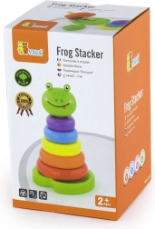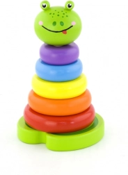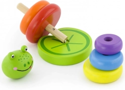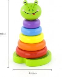 The wooden stackable pyramid Frog is an ideal toy for children from 2 years old. It is designed to help develop hand-eye coordination and enhance color differentiation skills. The toy consists of multicolored rings that stack on a wooden base with a cute frog on top.