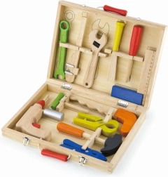 Practical wooden tool set in a sturdy case for little builders ages 3+. Includes 12 pieces (drill, hammer, saw, wrench, screwdriver, etc.) that develop fine motor skills, creativity, and pretend play. Compact size approx. 31.5 × 24 × 6 cm, metal latches and a red handle for easy carrying.