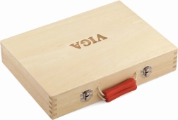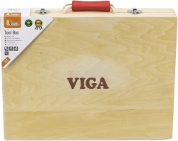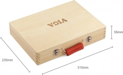 The sturdy wooden case with metal latches and a red handle keeps everything in place, so no piece gets lost. Thanks to the clear layout, every tool has its spot and the whole set is easy to carry on visits, trips, and into the kids’ room.