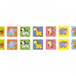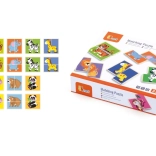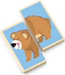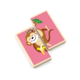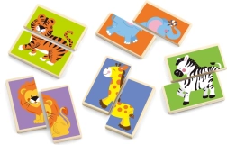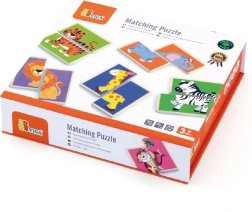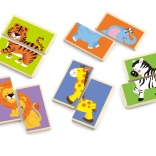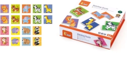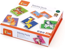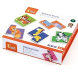 The puzzle supports fine motor skills, logical thinking, and visual perception by matching two parts with animals.