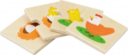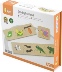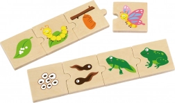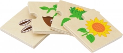 This set of wooden “growing” puzzles teaches children to understand the life cycles of animals and plants — from seed or egg to adulthood. Each theme consists of a sequence of pieces that fit together logically, naturally training fine motor skills, understanding of connections, and hand–eye coordination.