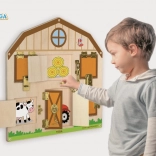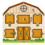This quality wooden toy in the shape of a little house offers several doors with different types of locks — hooks, hasps, chains, and sliding latches. With every opening, a surprise awaits in the form of illustrated animals, encouraging curiosity, focus, and hand–eye coordination.