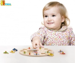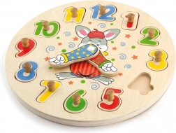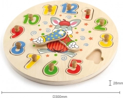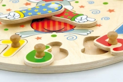 These wooden clocks combine a peg puzzle with learning to tell time. Colorful numbered pieces with practical knobs fit perfectly in little hands and support recognition of numbers 1–12. While assembling, children practice patience, hand–eye coordination, and perception of shapes and colors.
